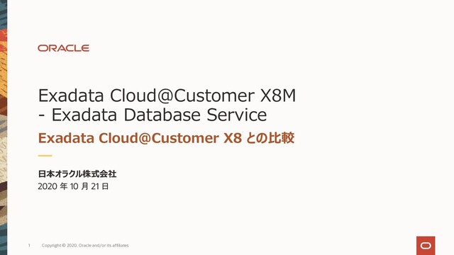 Oracle and/or its affiliates Exadata Cloud@Customer X8M XM Base System X8 Base System X8M Quarter X8 Quarter X8M Half X8 Half X8M Full X8 Full Database Server 数 2 2 4 8 Storage Server 数 3 3 6 12 最⼤ SQL Flash バンド幅 (GB/s) 25 75 64.5 150 129.0 300 258.0 最⼤ SQL PMEM/Flash Read IOPS 562,500 3,000,000* 1,119,400 6,000,000* 2,388,500 12,000,000* 4,776,000 最⼤ SQL Flash Write IOPS 518,000 1,410,000 1,088,000 2,820,000 2,176,000 5,640,000 4,352,000 * 最⼤ SQL PMEM Read IOPS Flash スループット 約 16% 向上 Flash Write IOPS 約 31% 向上 Read IOPS 約 2.7倍 向上 性能差無し Base System Quarter/Half/Full Rack