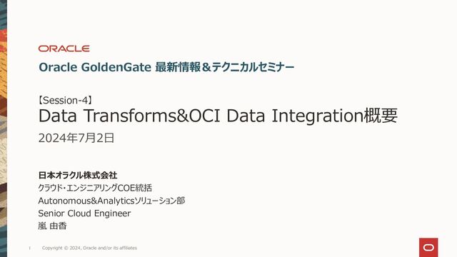 1. 【Session-4】 Data Transforms&OCI Data Integration概要 2024年7月2日 日本オラクル株式会社 クラウド・エンジニアリングCOE統括 Autonomous&Analyticsソリューション部 Senior