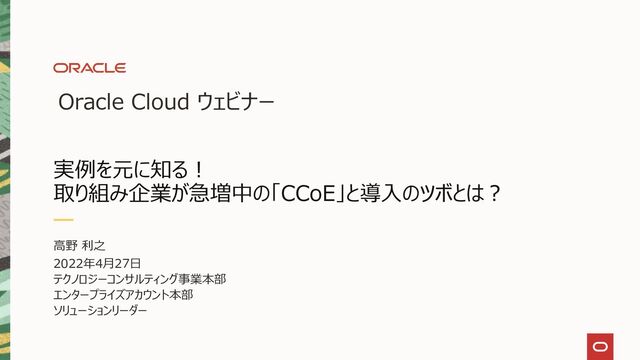 実例を元に知る!取り組み企業が急増中の「CCoE」と導入のツボとは?(Oracle Cloudウェビナーシリーズ)の資料です。2022年4月27日実施内容となります。