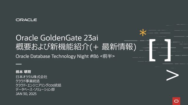 Applications and Analytics ) 65 Copyright © 2025, Oracle and/or its affiliates Source Database OCI - TOKYO Target Data Source Distribution Receiver Trail File Trail File 区切りテキスト Streaming OCI GG Deployment OCI GG Deployment (for DAA) 1000,'Houston',20,743113 1001,'Dallas',20,822416 1002,'San Francisco',21,157574 1003,'Los Angeles',21,743878 1004,'San Diego',21,840689 1005,'Chicago',23,616472 1006,'Memphis',23,580075 1007,'New York City',22,124434 1008,'Boston',22,275581 1009,'Washington D.C.',22,688002 Big Data用 各ハンドラ(lib) Source Database に対する処理を抽出し、for DAAに転送する for DAA の Kafkaハンドラを利用し、区切りテキストフォーマットを 選択し、Kafka トピックへ連携 JSON Object Storage