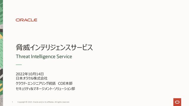脅威インテリジェンスサービス Threat Intelligence Service 2022年10⽉14⽇ ⽇本オラクル株式会社 クラウド・エンジニアリング統括 COE本部 セキュリティ&マネージメント・ソリューション部 1