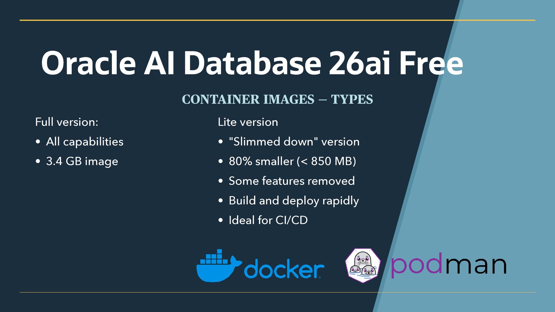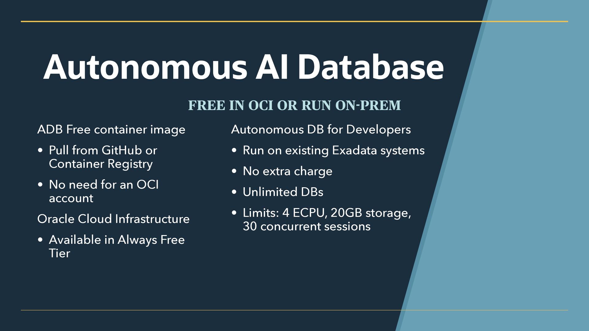 GitHub or Container Registry • No need for an OCI account Oracle Cloud Infrastructure • Available in Always Free Tier Autonomous DB for Developers • Run on existing Exadata systems • No extra charge • Unlimited DBs • Limits: 4 ECPU, 20GB storage, 30 concurrent sessions FREE IN OCI OR RUN ON - PREM