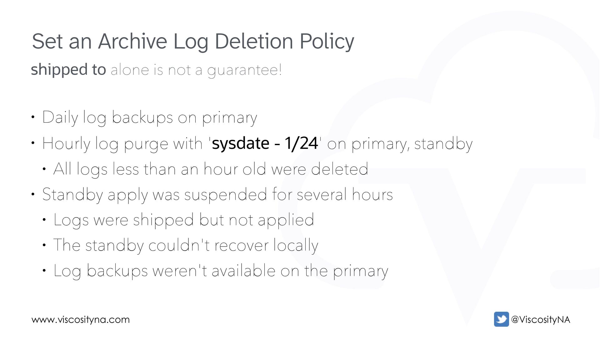 Daily log backups on primary • Hourly log purge with 'sysdate - 1/24' on primary, standby • All logs less than an hour old were deleted • Standby apply was suspended for several hours • Logs were shipped but not applied • The standby couldn't recover locally • Log backups weren't available on the primary Set an Archive Log Deletion Policy