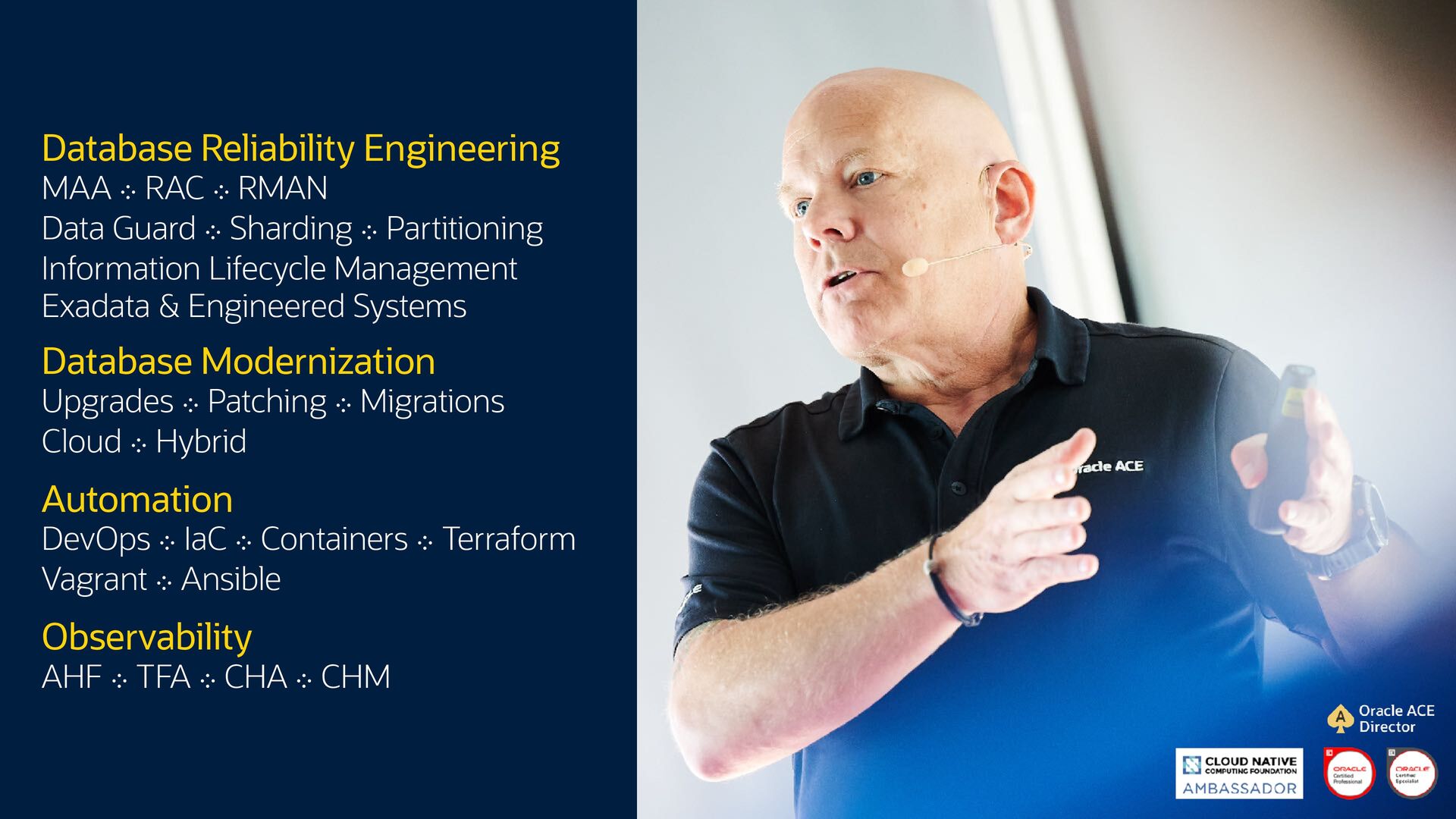 ⁘ Sharding ⁘ Partitioning Information Lifecycle Management Exadata & Engineered Systems Database Modernization Upgrades ⁘ Patching ⁘ Migrations Cloud ⁘ Hybrid Automation DevOps ⁘ IaC ⁘ Containers ⁘ Terraform Vagrant ⁘ Ansible Observability AHF ⁘ TFA ⁘ CHA ⁘ CHM