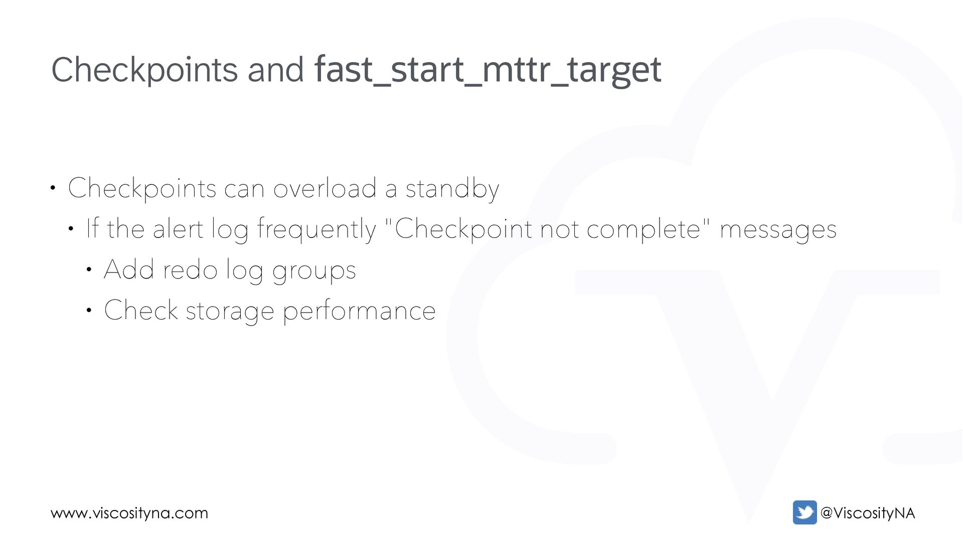 the alert log frequently "Checkpoint not complete" messages • Add redo log groups • Check storage performance Checkpoints and fast_start_mttr_target