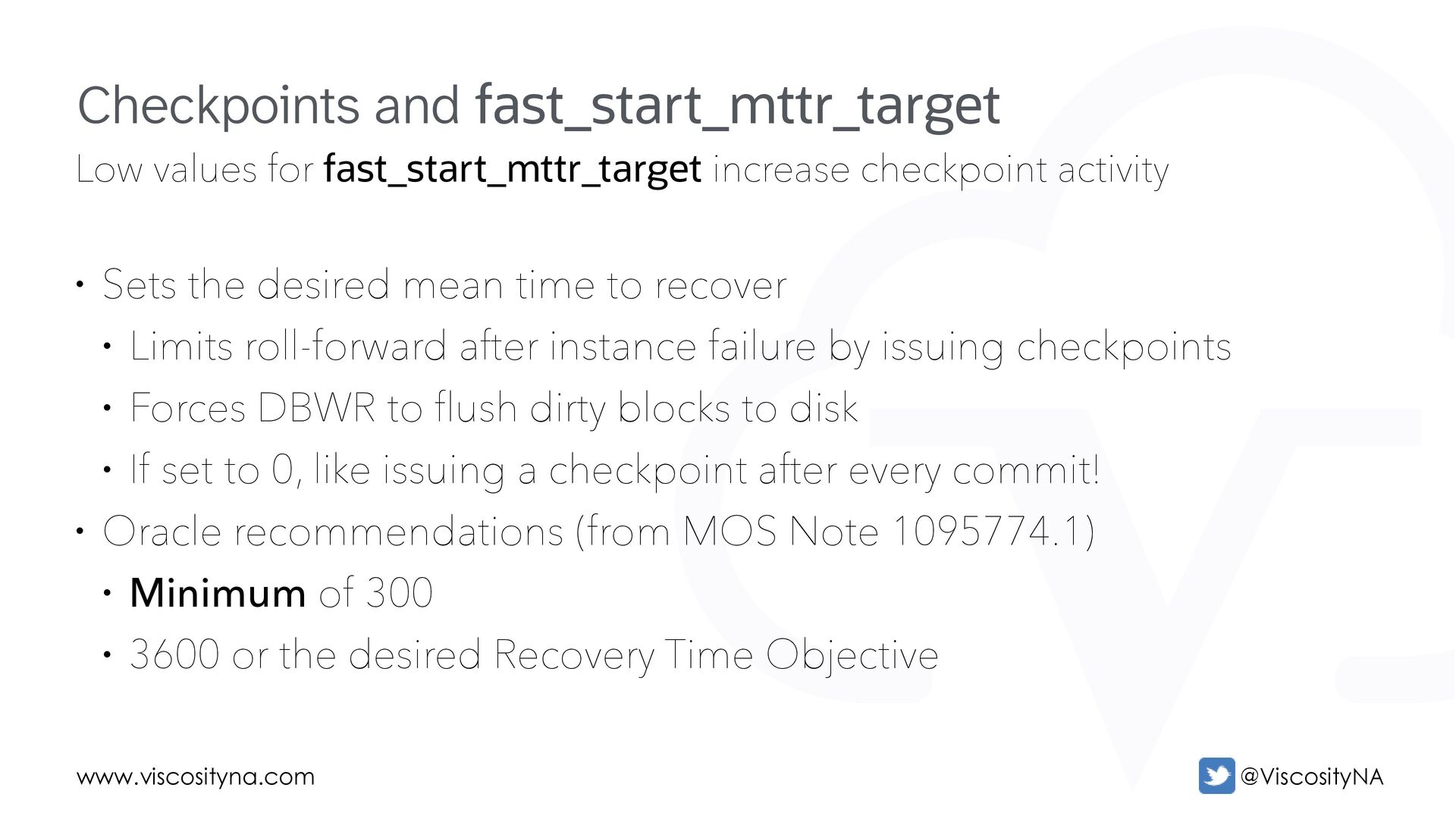 Sets the desired mean time to recover • Limits roll-forward after instance failure by issuing checkpoints • Forces DBWR to flush dirty blocks to disk • If set to 0, like issuing a checkpoint after every commit! • Oracle recommendations (from MOS Note 1095774.1) • Minimum of 300 • 3600 or the desired Recovery Time Objective Checkpoints and fast_start_mttr_target