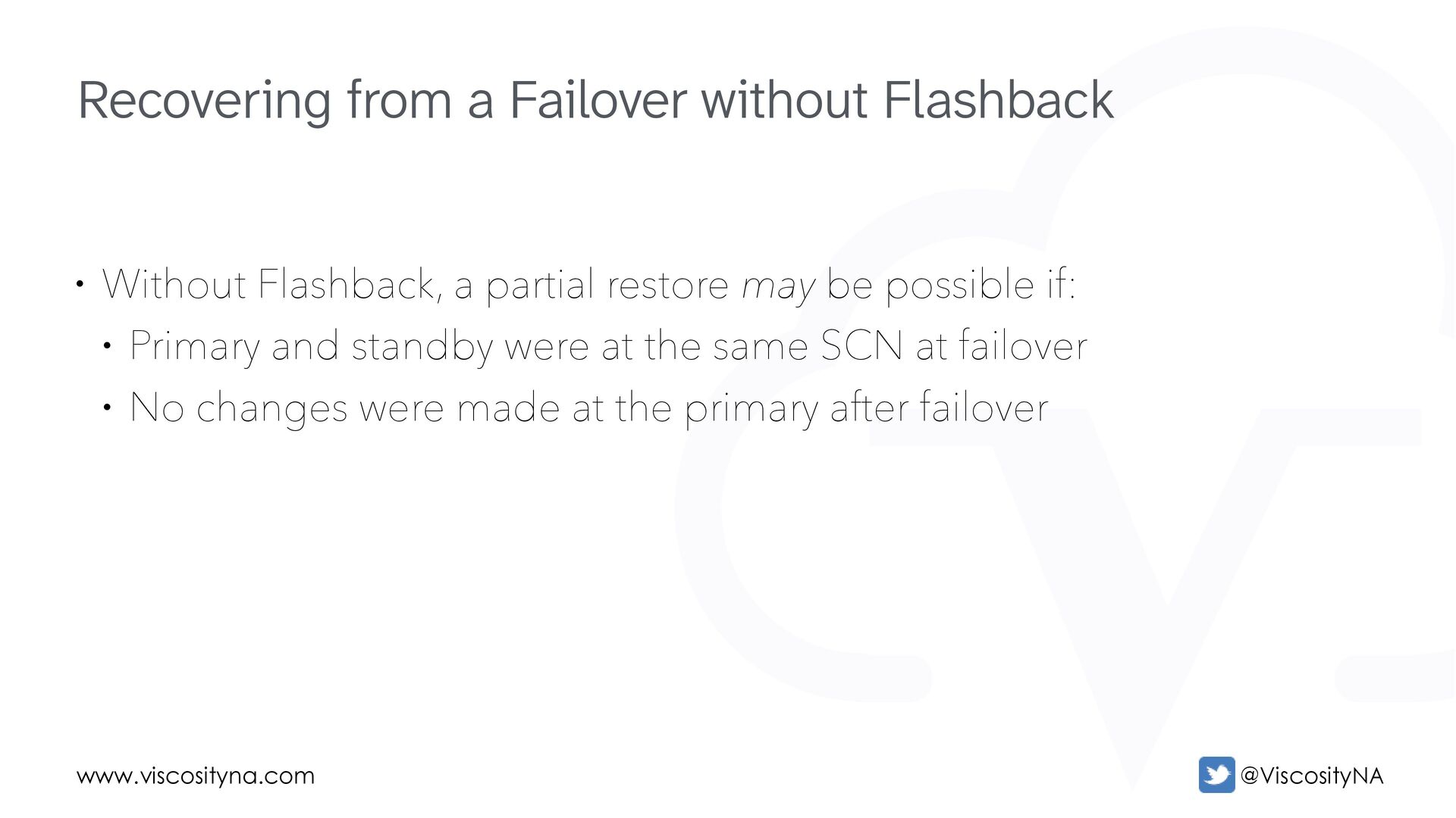 possible if: • Primary and standby were at the same SCN at failover • No changes were made at the primary after failover Recovering from a Failover without Flashback