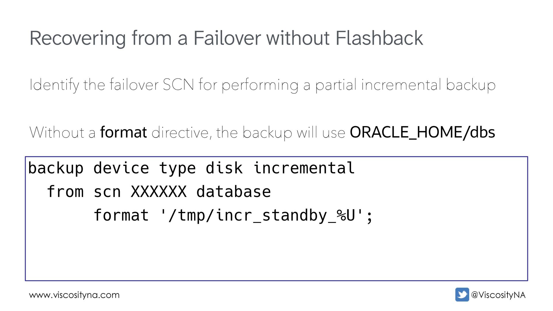 failover SCN for performing a partial incremental backup Without a format directive, the backup will use ORACLE_HOME/dbs backup device type disk incremental from scn XXXXXX database format '/tmp/incr_standby_%U';