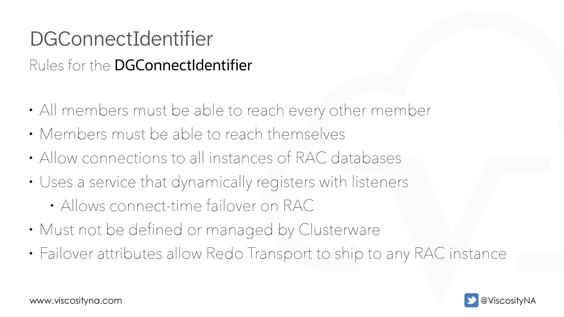 be able to reach every other member • Members must be able to reach themselves • Allow connections to all instances of RAC databases • Uses a service that dynamically registers with listeners • Allows connect-time failover on RAC • Must not be defined or managed by Clusterware • Failover attributes allow Redo Transport to ship to any RAC instance DGConnectIdentifier