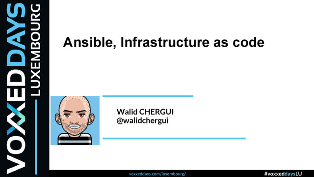 voxxeddays.com/luxembourg/ #voxxeddaysLU Ansible, Infrastructure as code Walid CHERGUI @walidchergui Ansible,