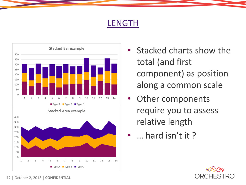 charts show the total (and first component) as position along a common scale • Other components require you to assess relative length • … hard isn’t it ?