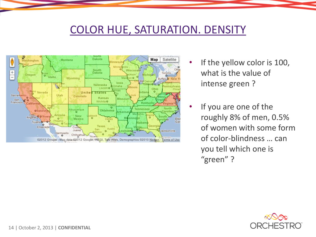 DENSITY • If the yellow color is 100, what is the value of intense green ? • If you are one of the roughly 8% of men, 0.5% of women with some form of color-blindness … can you tell which one is “green” ?