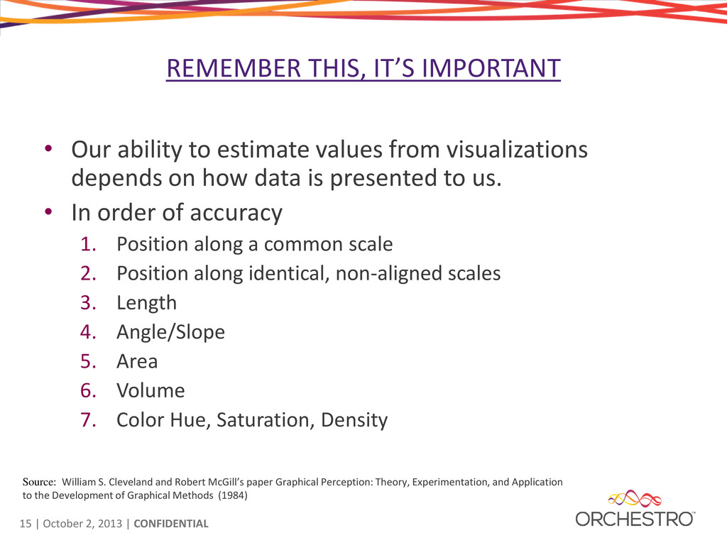 • Our ability to estimate values from visualizations depends on how data is presented to us. • In order of accuracy 1. Position along a common scale 2. Position along identical, non-aligned scales 3. Length 4. Angle/Slope 5. Area 6. Volume 7. Color Hue, Saturation, Density Source: William S. Cleveland and Robert McGill’s paper Graphical Perception: Theory, Experimentation, and Application to the Development of Graphical Methods (1984)