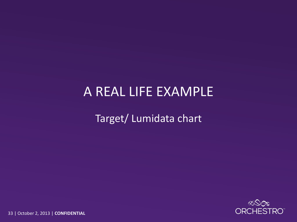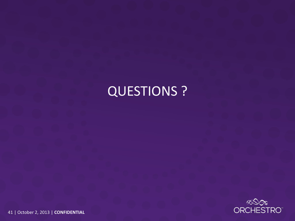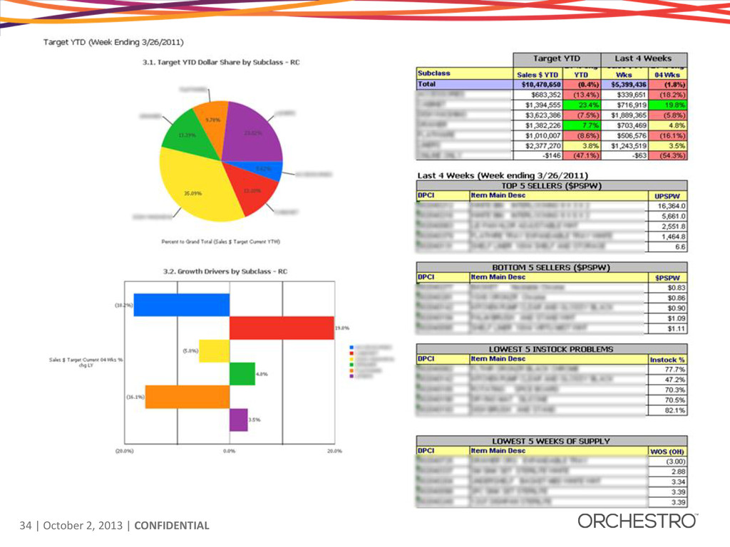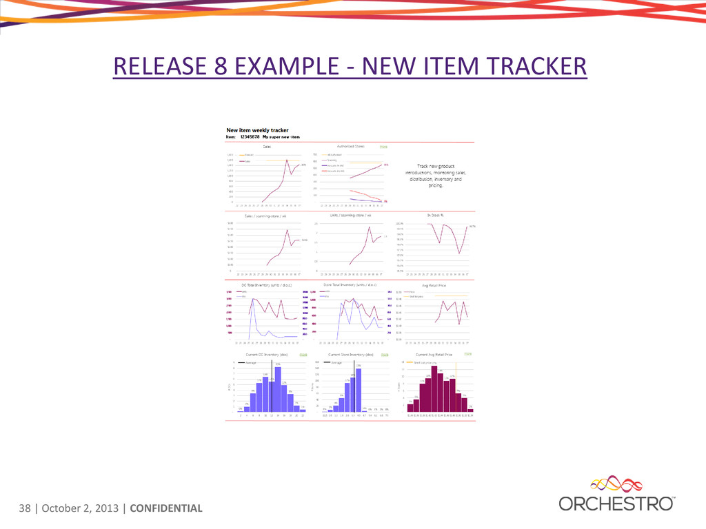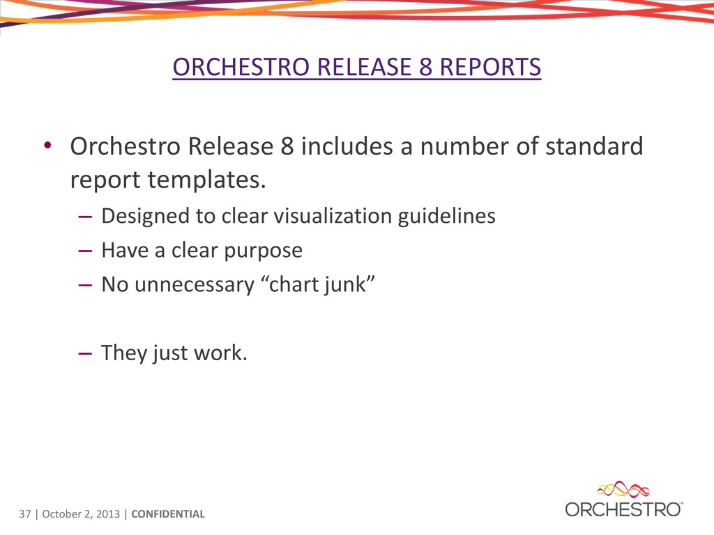 REPORTS • Orchestro Release 8 includes a number of standard report templates. – Designed to clear visualization guidelines – Have a clear purpose – No unnecessary “chart junk” – They just work.
