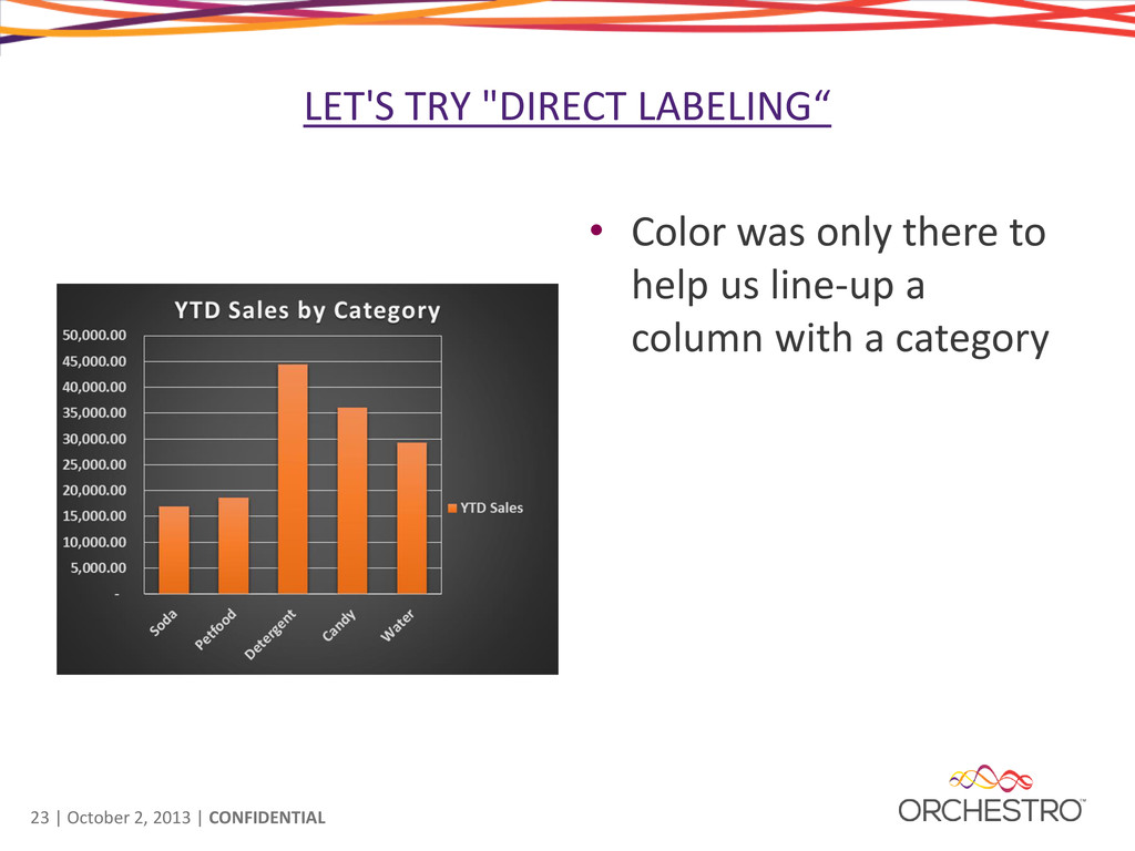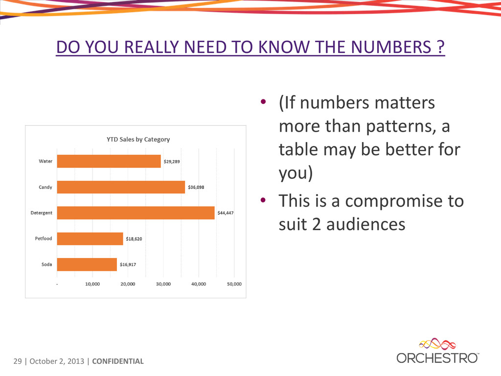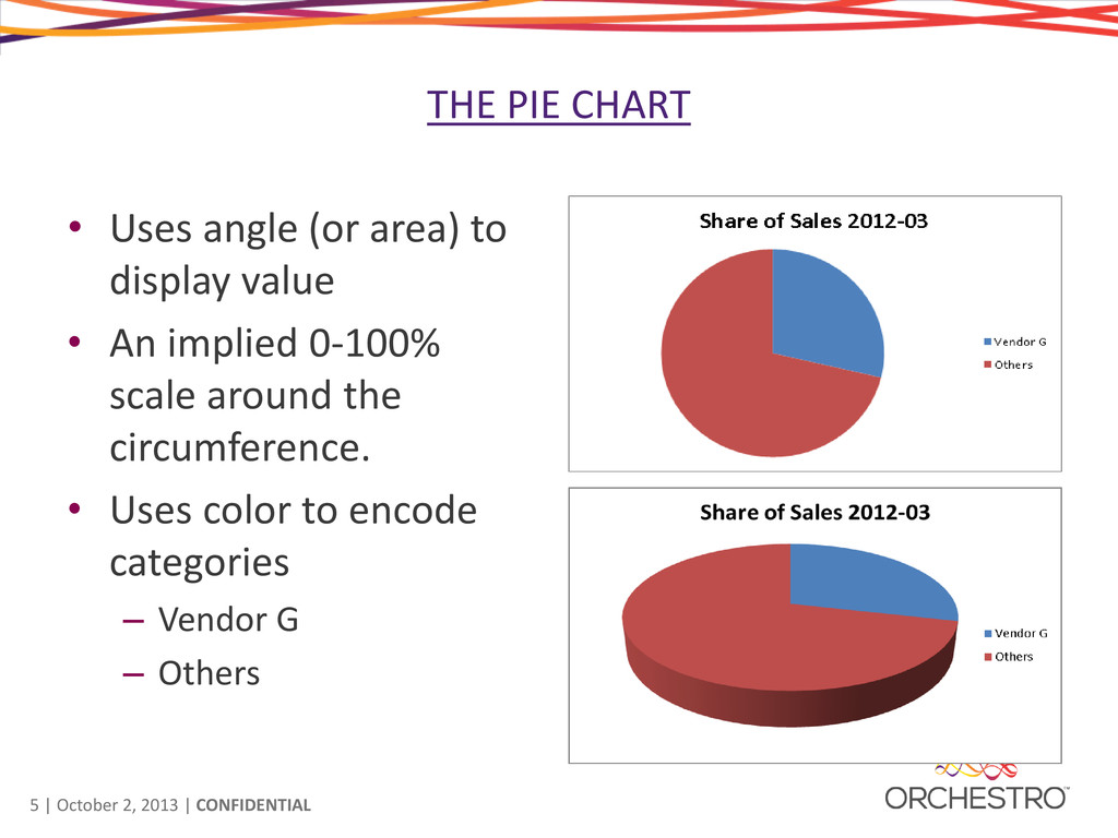 • The bar chart • Easy to read (even without the data labels) • Easy to identify which Vendor is associated with each bar • Provides much more data in the same space It just works… why ?