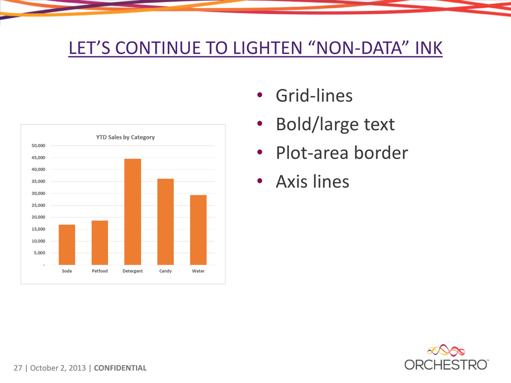 Easy to read – No pie charts – No multi-color bar charts – No need for a legend – No need to scan across graphics to get what I need – We use relative position to estimate value (what we’re best at) ! • Limited non-data ink (no chart junk) • Light banding helps you stay within a line.
