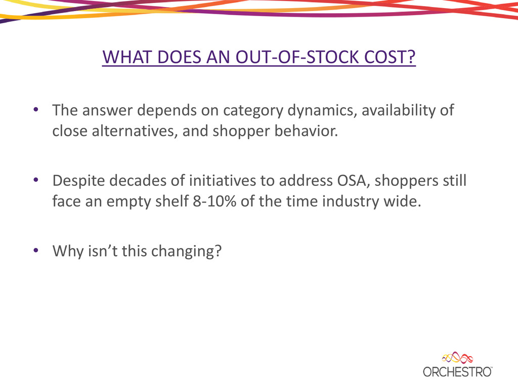 - In most categories, the optimal predictive model changes over time, as does the best approach to isolating various off-shelf availability events.