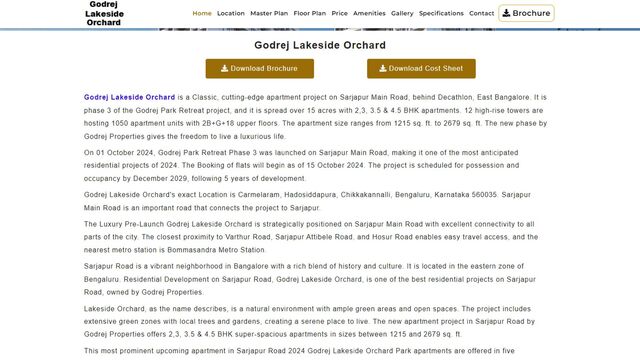The Godrej Lakeside Orchard building on Bangalore's Sarjapur Road is a wonderful fusion of modern lifestyle and peaceful surroundings. With 12 constructions, 1050 units, and apartment sizes ranging from 1215 to 2679 square feet, with plans ranging from 2 to 4.5 BHK, this project is poised to develop into a landmark urban destination. For both homeowners and investors, Godrej Lakeside Orchard is the right option because of its outstanding design, opulent places of work, and ecologically friendly features. https://www.godrejlakesideorchards.info/master-plan.html