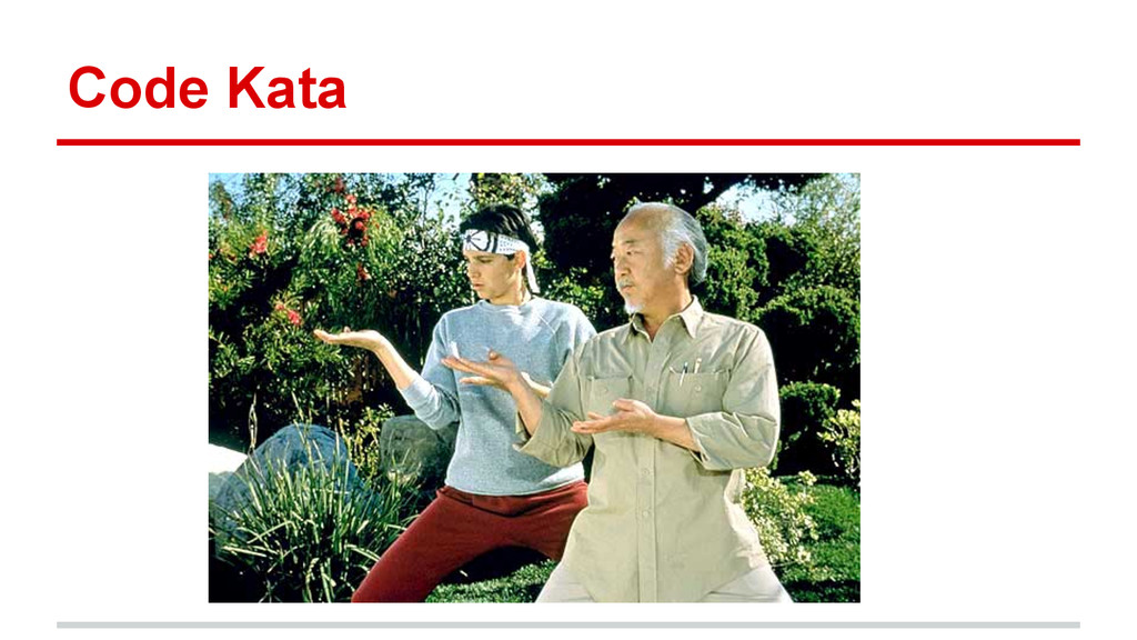 word, are the detailed choreographed patterns of movements practised either solo or in pairs. A code kata is an exercise in programming which helps a programmer hone their skills through practice and repetition. http://en.wikipedia.org/wiki/Kata_(programming) - http://en.wikipedia.org/wiki/Kata