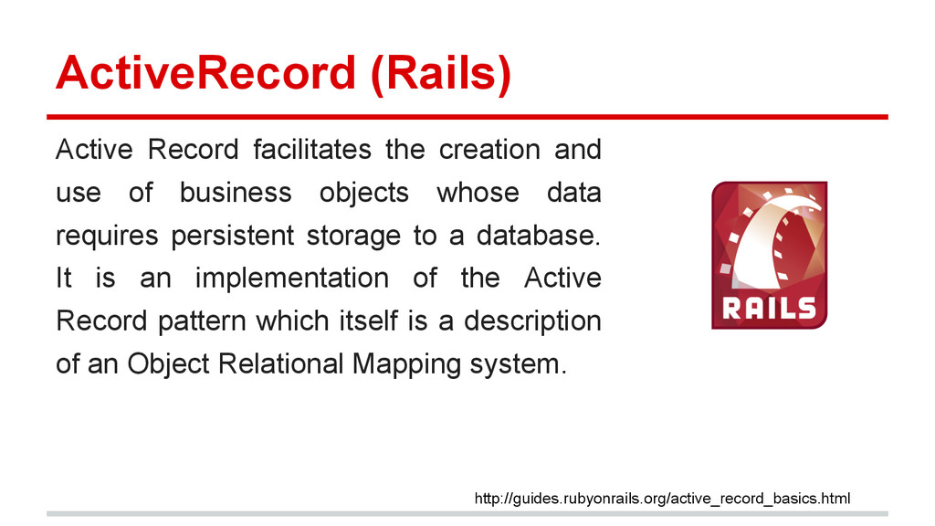 business objects whose data requires persistent storage to a database. It is an implementation of the Active Record pattern which itself is a description of an Object Relational Mapping system. http://guides.rubyonrails.org/active_record_basics.html