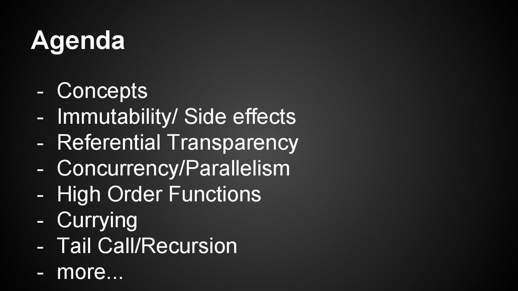 Concurrency/Parallelism - High Order Functions - Currying - Tail Call/Recursion - more... Agenda