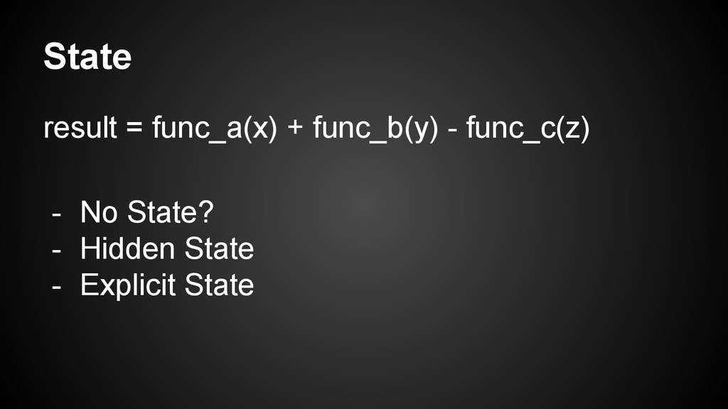 State result = func_a(x) + func_b(y) - func_c(z) - No