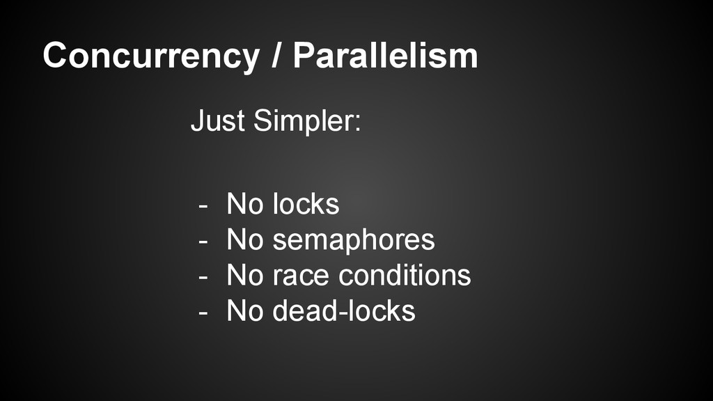 Concurrency / Parallelism Just Simpler: - No locks - No