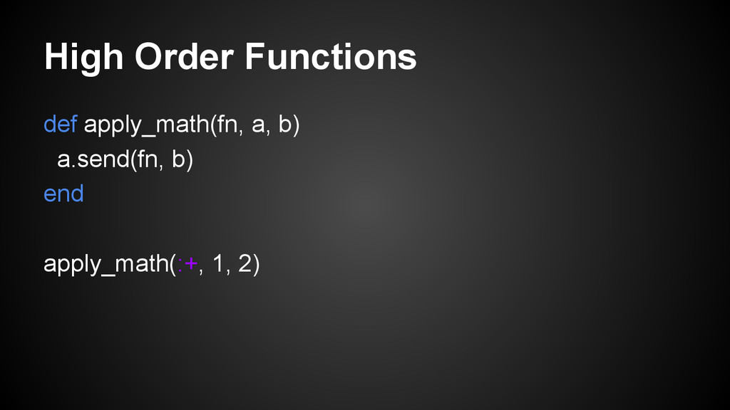 High Order Functions def apply_math(fn, a, b) a.send(fn, b) end