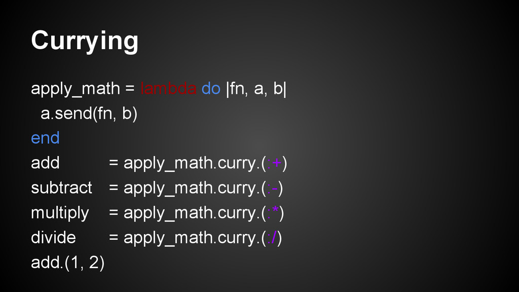 Currying apply_math = lambda do |fn, a, b| a.send(fn, b)