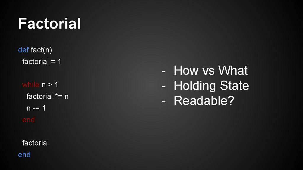 factorial *= n n -= 1 end factorial end - How vs What - Holding State - Readable?