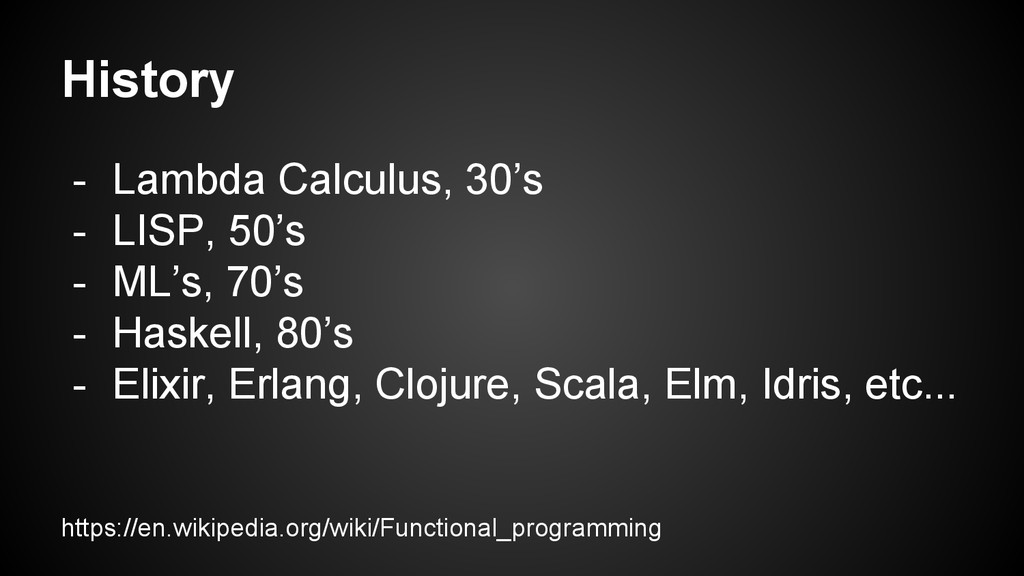 70’s - Haskell, 80’s - Elixir, Erlang, Clojure, Scala, Elm, Idris, etc... https://en.wikipedia.org/wiki/Functional_programming