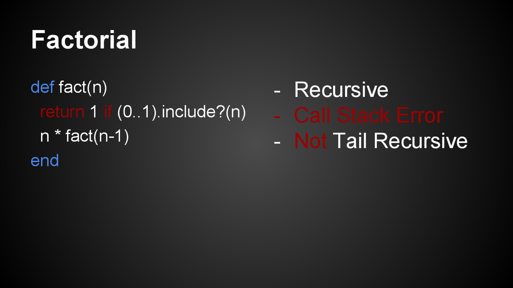 fact(n-1, n*acc) end - Recursive - Call Stack Error - Tail Recursive