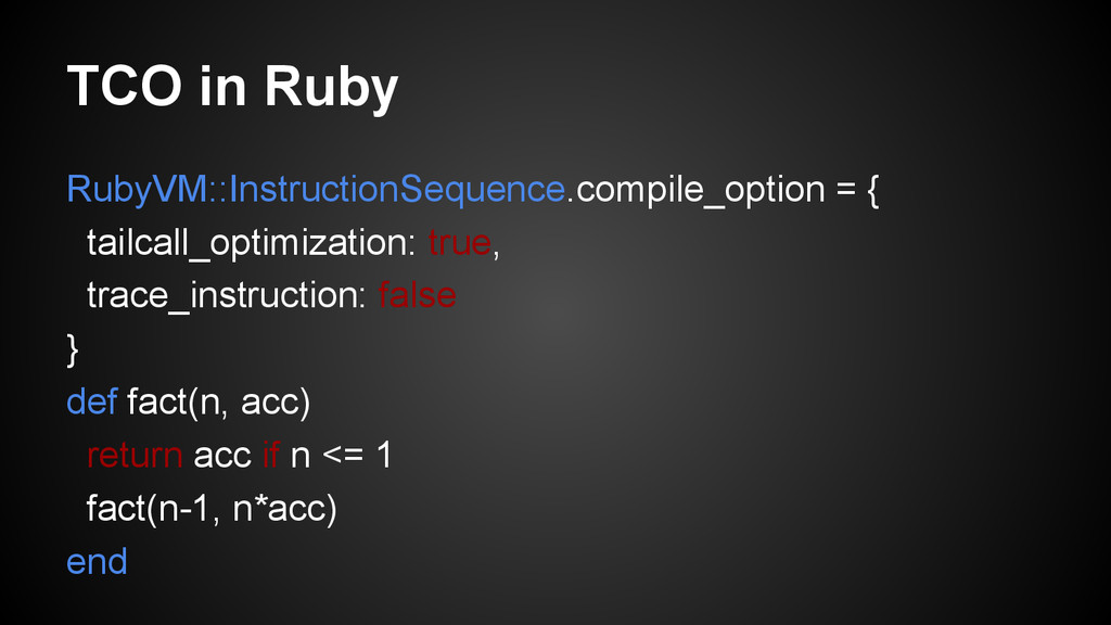 TCO in Ruby RubyVM::InstructionSequence.compile_option = { tailcall_optimization: true, trace_instruction: false