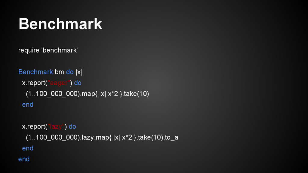 Benchmark require 'benchmark' Benchmark.bm do |x| x.report("eager") do (1..100_000_000).map{ |x|