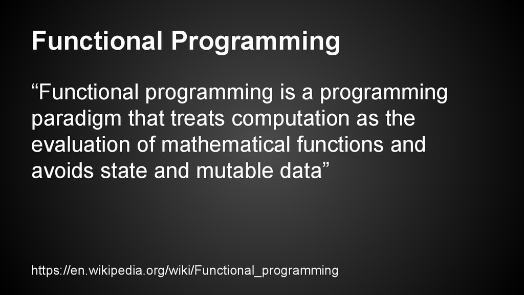 computation as the evaluation of mathematical functions and avoids state and mutable data” https://en.wikipedia.org/wiki/Functional_programming