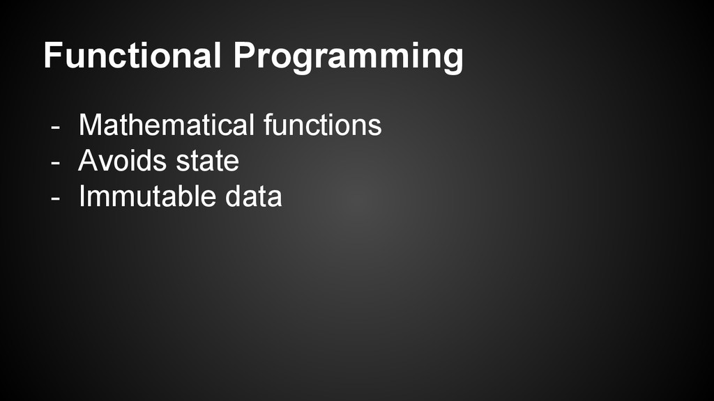 Functional Programming - Mathematical functions - Avoids state - Immutable