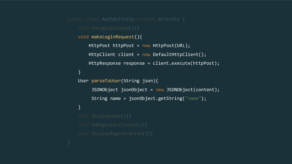 { void login(Callback callback){ ... User user = parseToUser(json); } User parseToUser(String content) { JSONObject jsonObject = new JSONObject(content); String name = jsonObject.getString("name"); return new User(name); } }