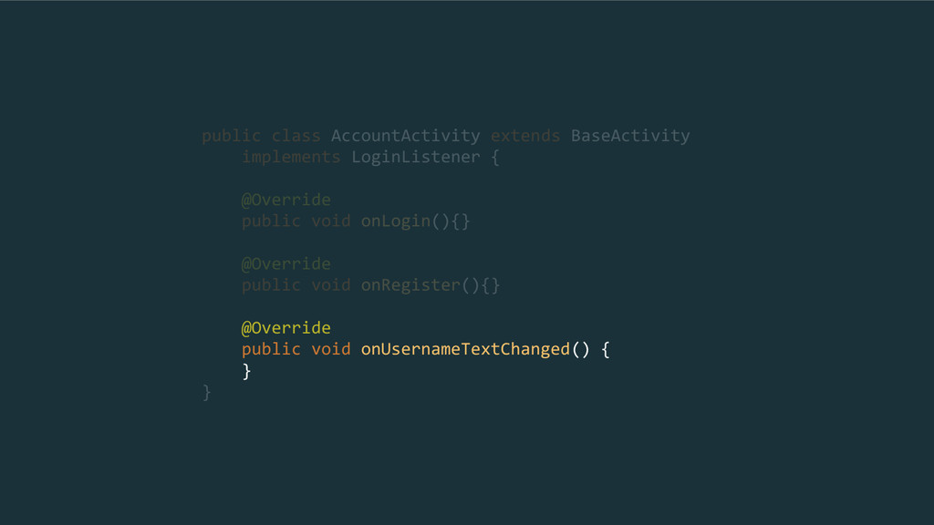 } public class AuthActivity extends BaseActivity implements LoginListener { @Override public void onLogin(){} @Override public void onRegister(){} @Override public void onUsernameTextChanged() { showToastMessage(); } }
