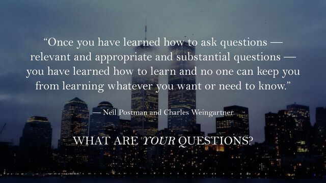 and appropriate and substantial questions — you have learned how to learn and no one can keep you from learning whatever you want or need to know.” — Neil Postman and Charles Weingartner WHAT ARE YOUR QUESTIONS?