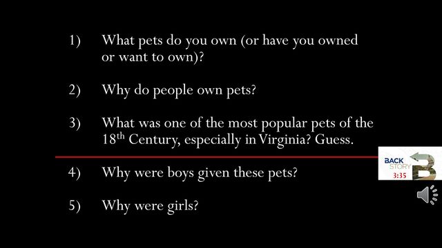 or want to own)? 2) Why do people own pets? 3) What was one of the most popular pets of the 18th Century, especially in Virginia? Guess. 4) Why were boys given these pets? 5) Why were girls? 3:35
