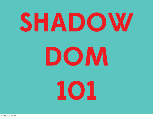 = dom.createShadowRoot(); 4 shadow.innerHTML = '<h2>Yay, ShadowDOM!</h2>'; 5 shadow.resetStyleInheritance = true; 6 </script> Friday, July 12, 13