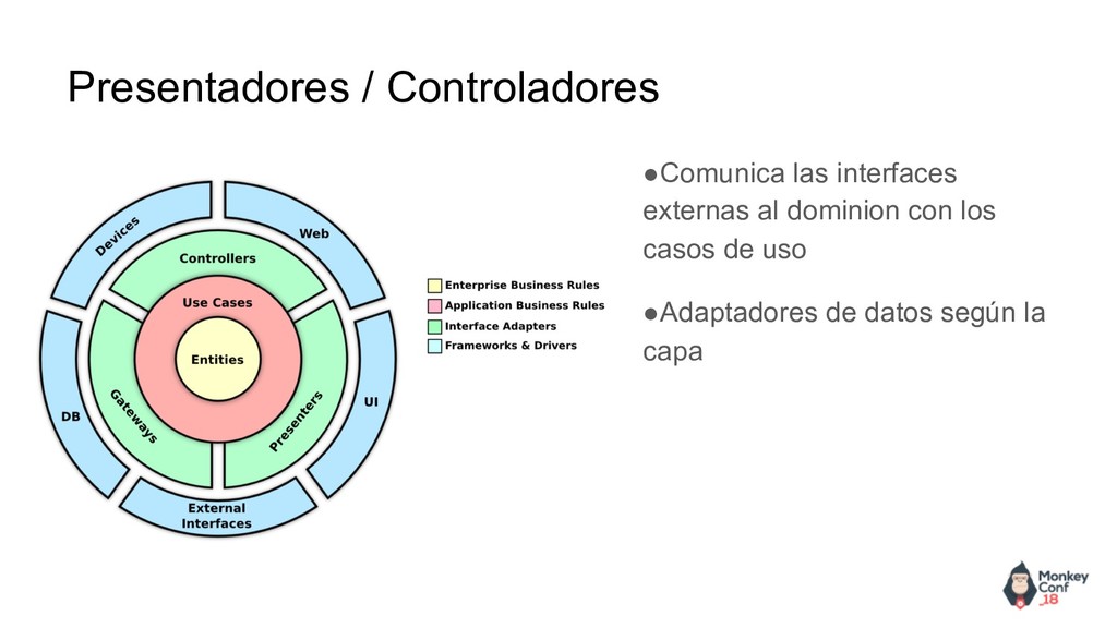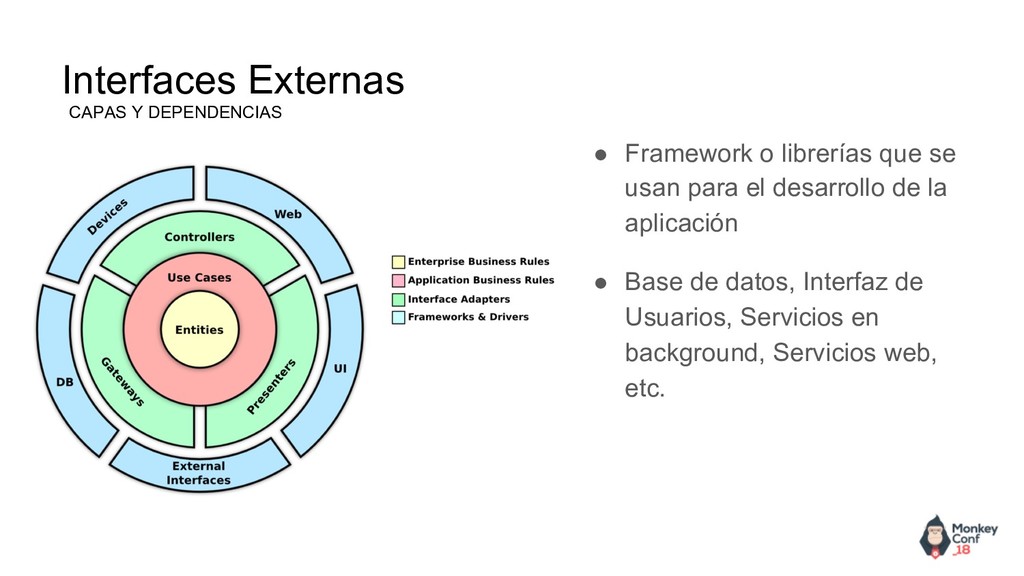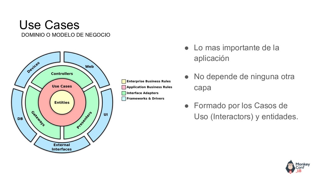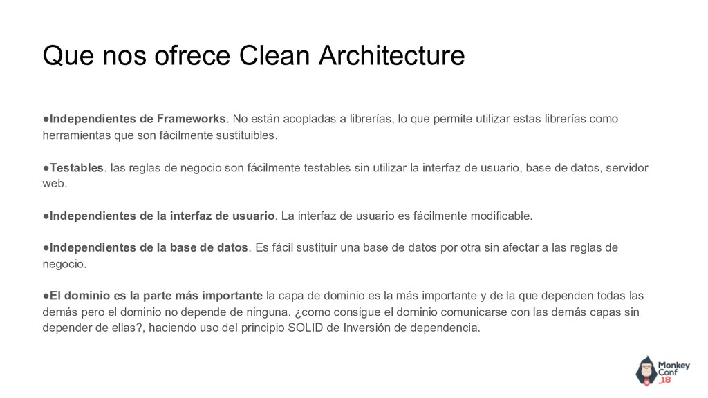 permite utilizar estas librerías como herramientas que son fácilmente sustituibles. •Testables. las reglas de negocio son fácilmente testables sin utilizar la interfaz de usuario, base de datos, servidor web. •Independientes de la interfaz de usuario. La interfaz de usuario es fácilmente modificable. •Independientes de la base de datos. Es fácil sustituir una base de datos por otra sin afectar a las reglas de negocio. •El dominio es la parte más importante la capa de dominio es la más importante y de la que dependen todas las demás pero el dominio no depende de ninguna. ¿como consigue el dominio comunicarse con las demás capas sin depender de ellas?, haciendo uso del principio SOLID de Inversión de dependencia. Que nos ofrece Clean Architecture