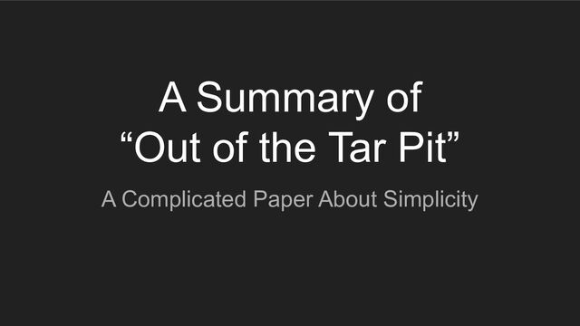In 2006, a white paper by Ben Moseley and Peter Marks called "Out of the Tar Pit" gave developers new hope for tackling the growing complexity of enterprise-level applications. In the paper, the authors identify several ways application complexity gets out of hand, how to correct it, and how to keep things simple as your features grow.