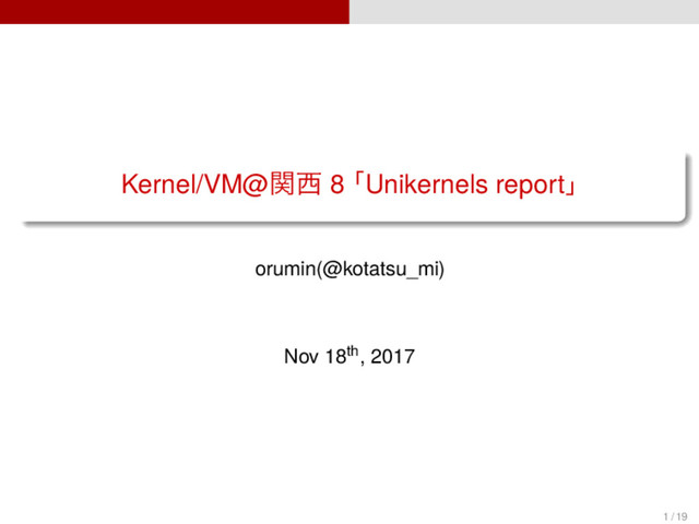 The NIST Definition of Cloud Computing,” Tech. Rep., Sep. 2011. doi: 10.6028/NIST.SP.800-145. [8] A. Belay, A. Bittau, A. Mashtizadeh, D. Terei, D. Mazières, and C. Kozyrakis, “Dune: Safe User-level Access to Privileged CPU Features,” 10th USENIX Symposium on Operating Systems Design and Implementation, ser. OSDI ’12, Hollywood, CA, USA: USENIX Assocation, Oct. 2012, pp. 335–348, isbn: 978-1-931971-96-6. [9] A. Kantee, “Flexible Operating System Internals: The Design and Implementation of the Anykernel and Rump Kernels,” PhD, Aalto University, 2012, p. 358, isbn: 978-952-60-4916-8. [10] ——,“Kernel Development in Userspace - The Rump Approach,” BSDCan 2009, ser. BSDCan, Ottawa, ON, Canada, May 2009, pp. 1–12. [11] A. Kantee and J. Cormack, “Rump Kernels: No OS? No Problem!” ;login:, vol. 39, no. 5, pp. 11–17, Oct. 2014, issn: 0971-8044. doi: 10.1007/BF02896304. [12] DeferPanic, DeferPanic, 2015. (visited on 08/25/2016). [13] A. Bratterud, A.-A. Walla, H. Haugerud, P. E. Engelstad, and K. Begnum, “IncludeOS: A Minimal, Resource Efficient Unikernel for Cloud Services,” 2015 IEEE 7th International Conference on Cloud Computing Technology and Science, ser. CloudCom 2015, Vancouver, BC, Canada: IEEE, Nov. 2015, pp. 250–257, isbn: 978-1-4673-9560-1. doi: 10.1109/CloudCom.2015.89. 20 / 19