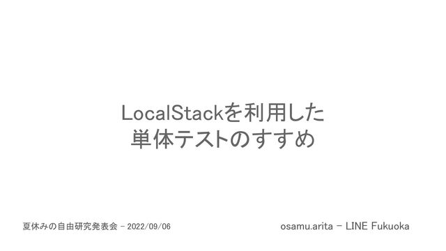 LocalStackを利用した 単体テストのすすめ osamu.arita - LINE Fukuoka 夏休みの自由研究発表会 - 2022/09/06