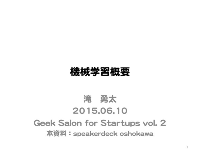 機械学習概要 この資料には、弊社のノウハウ、営業機密等が含まれておりますので、お取り扱いには十分ご留意 願います。この資料およびその内容を、弊社に無断で使用、複写、破壊、改�ざんすること、ならび に第三者へ開示すること、漏洩すること、あるいは使用させることは、固くお断り申しあげます。 滝 勇太 22001155..0066..1100 GGeeeekk SSaalloonn ffoorr SSttaarrttuuppss