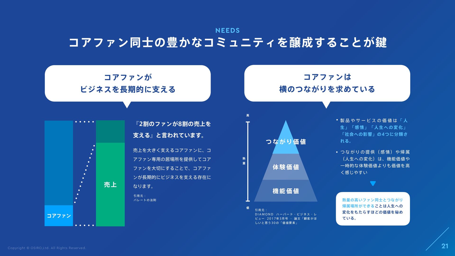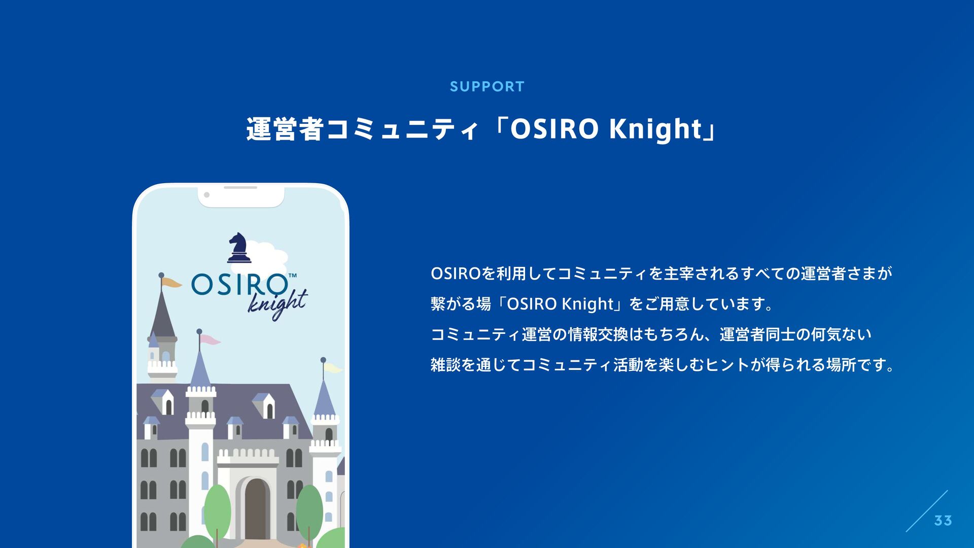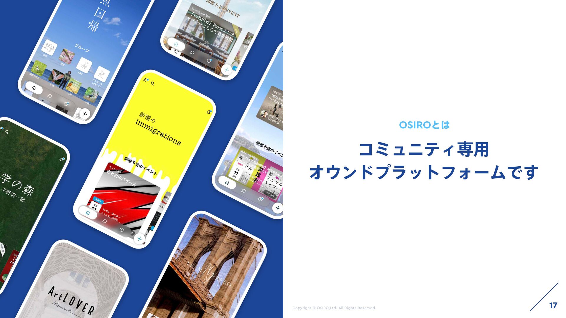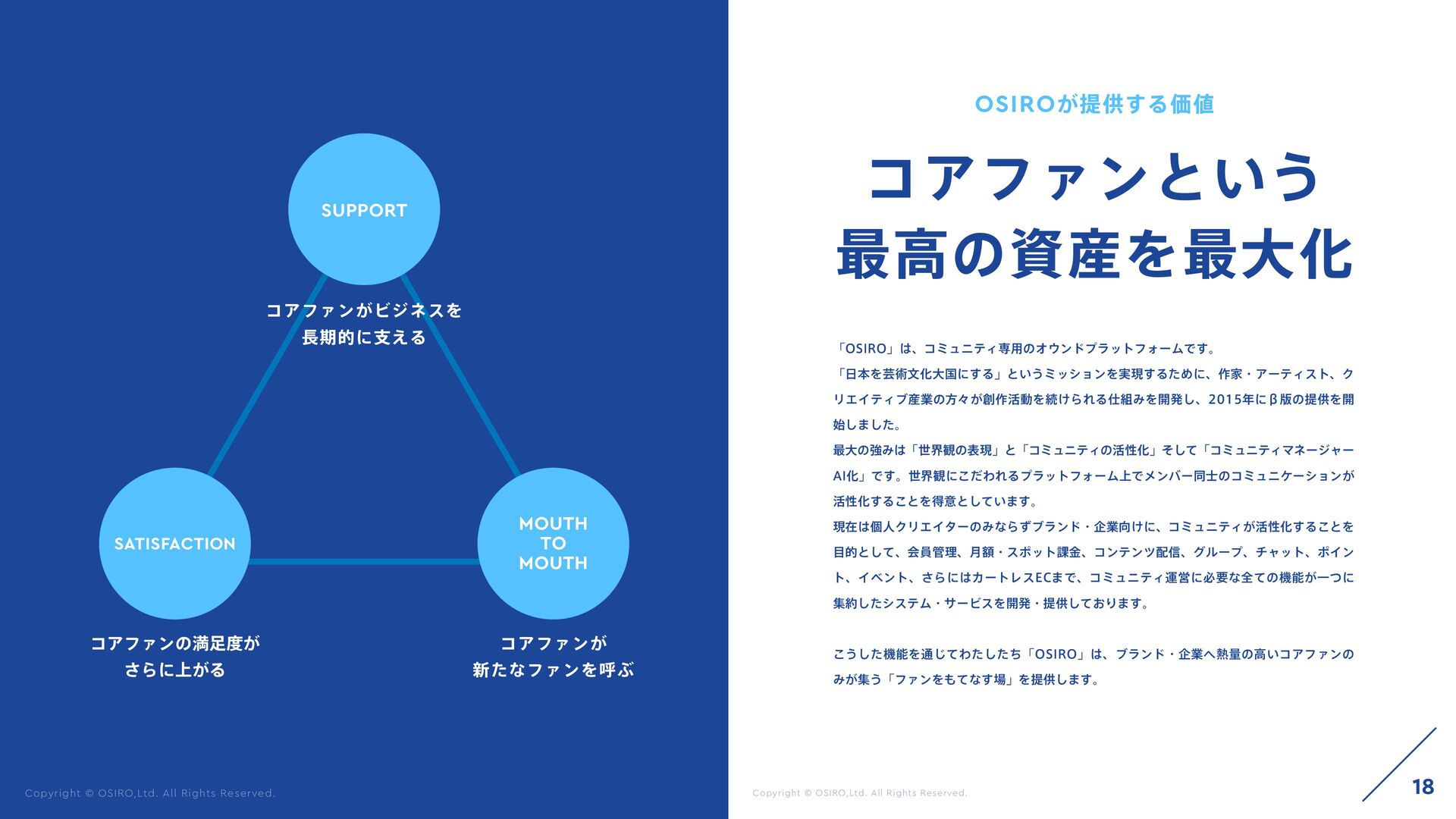 ʮ04*30ʯɺίϛϡχςΟઐ༻ͷΦϯυϓϥοτϑΥʔϜͰ͢ɻ ʮຊΛܳज़จԽେࠃʹ͢Δʯͱ͍͏ϛογϣϯΛ࣮ݱ͢ΔͨΊʹɺ࡞ՈɾΞʔςΟετɺΫ ϦΤΠςΟϒ࢈ۀͷํʑ͕࡞׆ಈΛଓ͚ΒΕΔΈΛ։ൃ͠ɺʹЌ൛ͷఏڙΛ։ ࢝͠·ͨ͠ɻ ࠷େͷڧΈʮੈք؍ͷදݱʯͱʮίϛϡχςΟͷ׆ੑԽʯͦͯ͠ʮίϛϡχςΟϚωʔδϟʔ "*ԽʯͰ͢ɻੈք؍ʹͩ͜ΘΕΔϓϥοτϑΥʔϜ্Ͱϝϯόʔಉ࢜ͷίϛϡχέʔγϣϯ͕ ׆ੑԽ͢Δ͜ͱΛಘҙͱ͍ͯ͠·͢ɻ ݱࡏݸਓΫϦΤΠλʔͷΈͳΒͣϒϥϯυɾاۀ͚ʹɺίϛϡχςΟ͕׆ੑԽ͢Δ͜ͱΛ తͱͯ͠ɺձһཧɺֹ݄ɾεϙοτ՝ۚɺίϯςϯπ৴ɺάϧʔϓɺνϟοτɺϙΠϯ τɺΠϕϯτɺ͞ΒʹΧʔτϨε&$·ͰɺίϛϡχςΟӡӦʹඞཁͳશͯͷػೳ͕Ұͭʹ ूͨ͠γεςϜɾαʔϏεΛ։ൃɾఏڙ͓ͯ͠Γ·͢ɻ ͜͏ͨ͠ػೳΛ௨ͯ͡Θͨͨͪ͠ʮ04*30ʯɺϒϥϯυɾاۀྔͷߴ͍ίΞϑΝϯͷ Έ͕ू͏ʮϑΝϯΛͯͳ͢ʯΛఏڙ͠·͢ɻ SUPPORT ίΞϑΝϯͷຬ͕ ͞Βʹ্͕Δ ίΞϑΝϯ͕ ৽ͨͳϑΝϯΛݺͿ ίΞϑΝϯ͕ϏδωεΛ ظతʹࢧ͑Δ SATISFACTION MOUTH TO MOUTH Copyright © OSIRO,Ltd. All Rights Reserved. Copyright © OSIRO,Ltd. All Rights Reserved.
