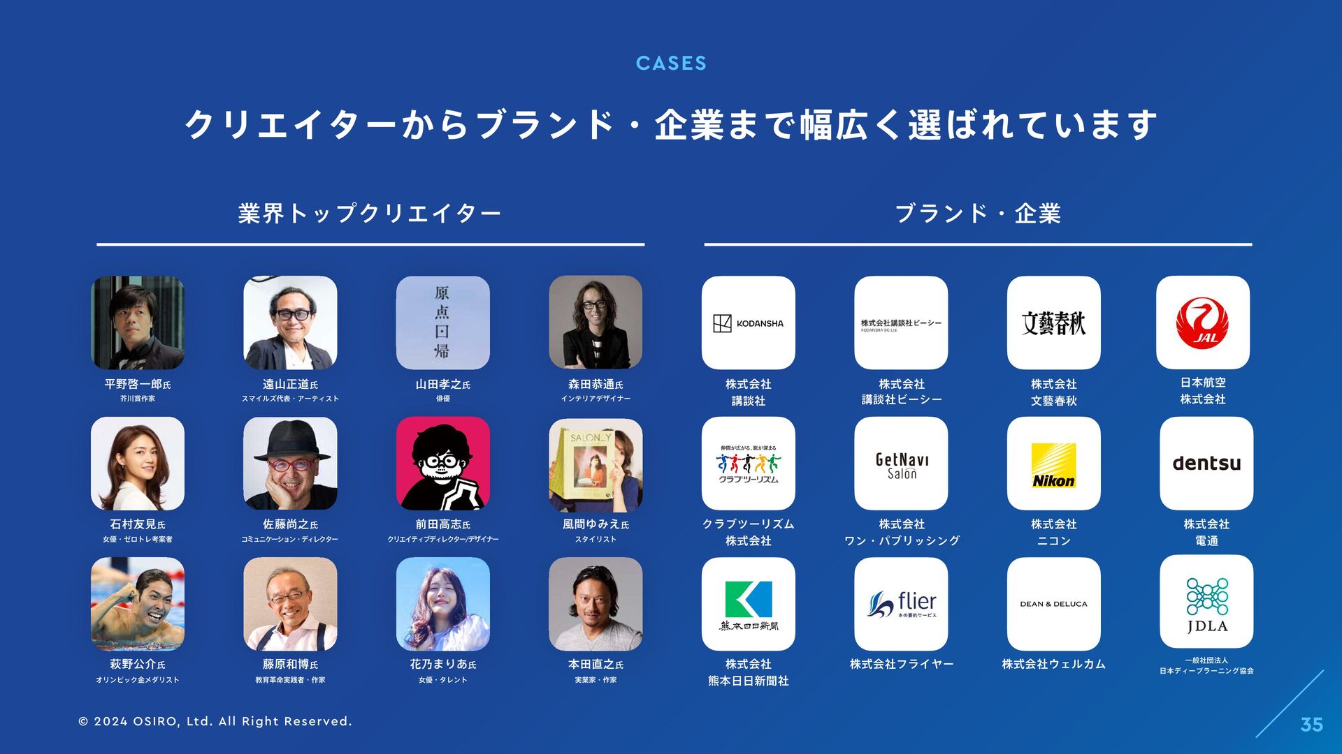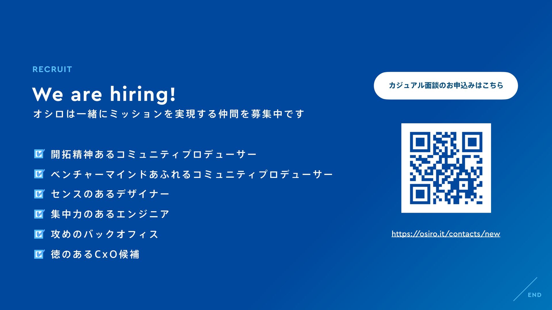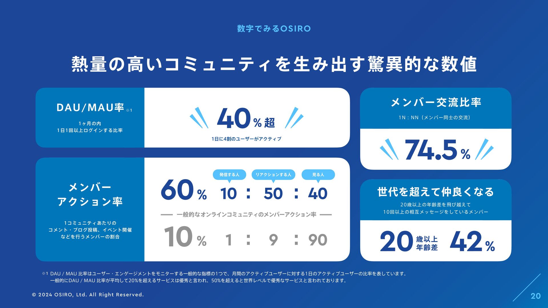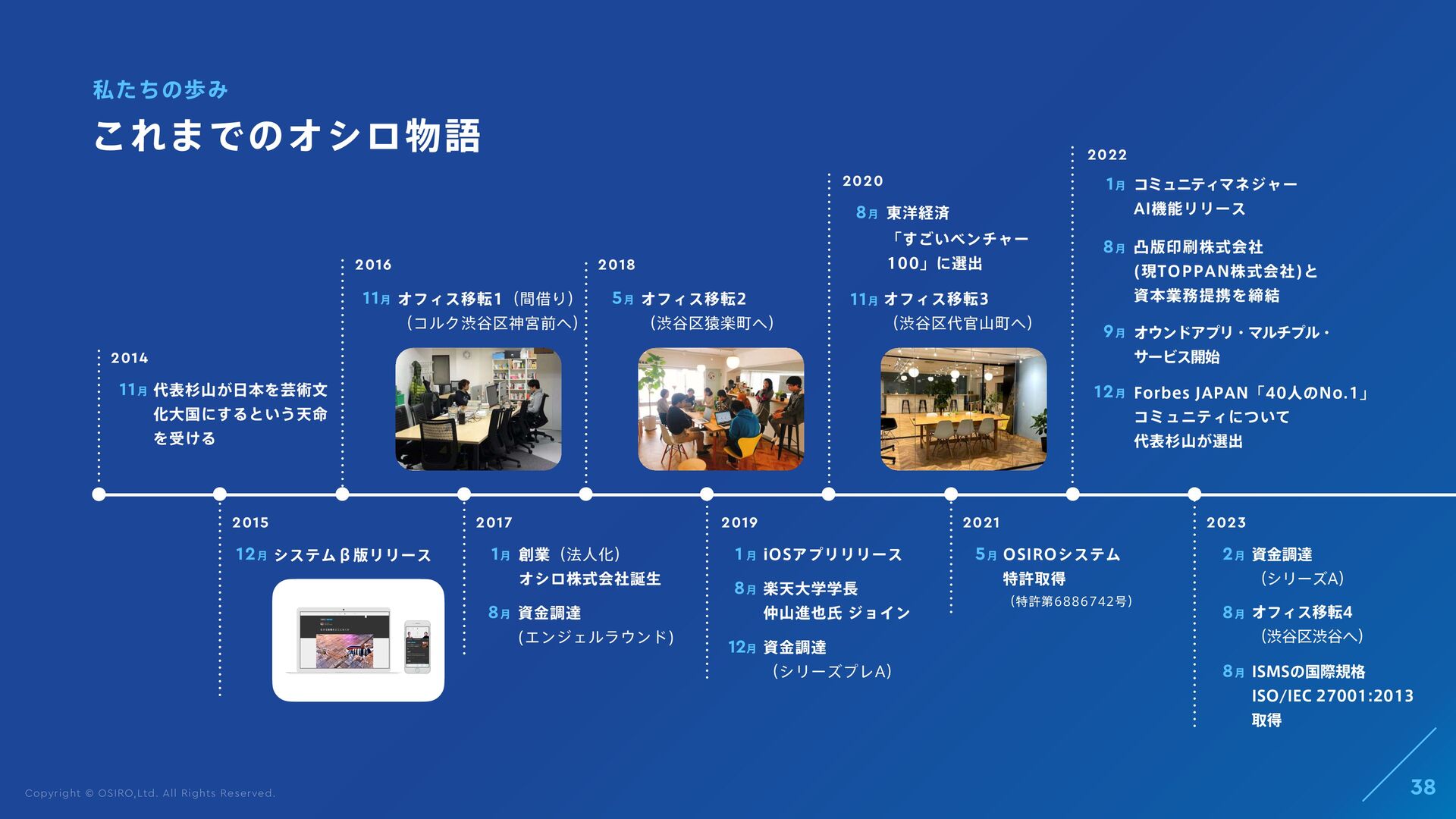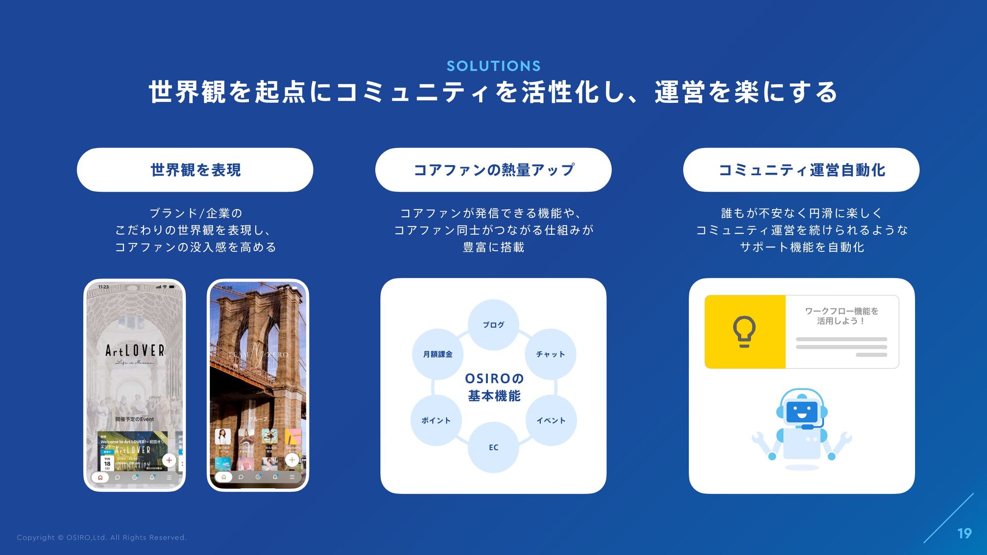 ʮ04*30ʯɺίϛϡχςΟઐ༻ͷΦϯυϓϥοτϑΥʔϜͰ͢ɻ ʮຊΛܳज़จԽେࠃʹ͢Δʯͱ͍͏ϛογϣϯΛ࣮ݱ͢ΔͨΊʹɺ࡞ՈɾΞʔςΟετɺΫ ϦΤΠςΟϒ࢈ۀͷํʑ͕࡞׆ಈΛଓ͚ΒΕΔΈΛ։ൃ͠ɺʹЌ൛ͷఏڙΛ։ ࢝͠·ͨ͠ɻ ࠷େͷڧΈʮੈք؍ͷදݱʯͱʮίϛϡχςΟͷ׆ੑԽʯͦͯ͠ʮίϛϡχςΟϚωʔδϟʔ "*ԽʯͰ͢ɻੈք؍ʹͩ͜ΘΕΔϓϥοτϑΥʔϜ্Ͱϝϯόʔಉ࢜ͷίϛϡχέʔγϣϯ͕ ׆ੑԽ͢Δ͜ͱΛಘҙͱ͍ͯ͠·͢ɻ ݱࡏݸਓΫϦΤΠλʔͷΈͳΒͣϒϥϯυɾاۀ͚ʹɺίϛϡχςΟ͕׆ੑԽ͢Δ͜ͱΛ తͱͯ͠ɺձһཧɺֹ݄ɾεϙοτ՝ۚɺίϯςϯπ৴ɺάϧʔϓɺνϟοτɺϙΠϯ τɺΠϕϯτɺ͞ΒʹΧʔτϨε&$·ͰɺίϛϡχςΟӡӦʹඞཁͳશͯͷػೳ͕Ұͭʹ ूͨ͠γεςϜɾαʔϏεΛ։ൃɾఏڙ͓ͯ͠Γ·͢ɻ ͜͏ͨ͠ػೳΛ௨ͯ͡Θͨͨͪ͠ʮ04*30ʯɺϒϥϯυɾاۀྔͷߴ͍ίΞϑΝϯͷ Έ͕ू͏ʮϑΝϯΛͯͳ͢ʯΛఏڙ͠·͢ɻ SUPPORT ίΞϑΝϯͷຬ͕ ͞Βʹ্͕Δ ίΞϑΝϯ͕ ৽ͨͳϑΝϯΛݺͿ ίΞϑΝϯ͕ϏδωεΛ ظతʹࢧ͑Δ SATISFACTION MOUTH TO MOUTH Copyright © OSIRO,Ltd. All Rights Reserved. Copyright © OSIRO,Ltd. All Rights Reserved.