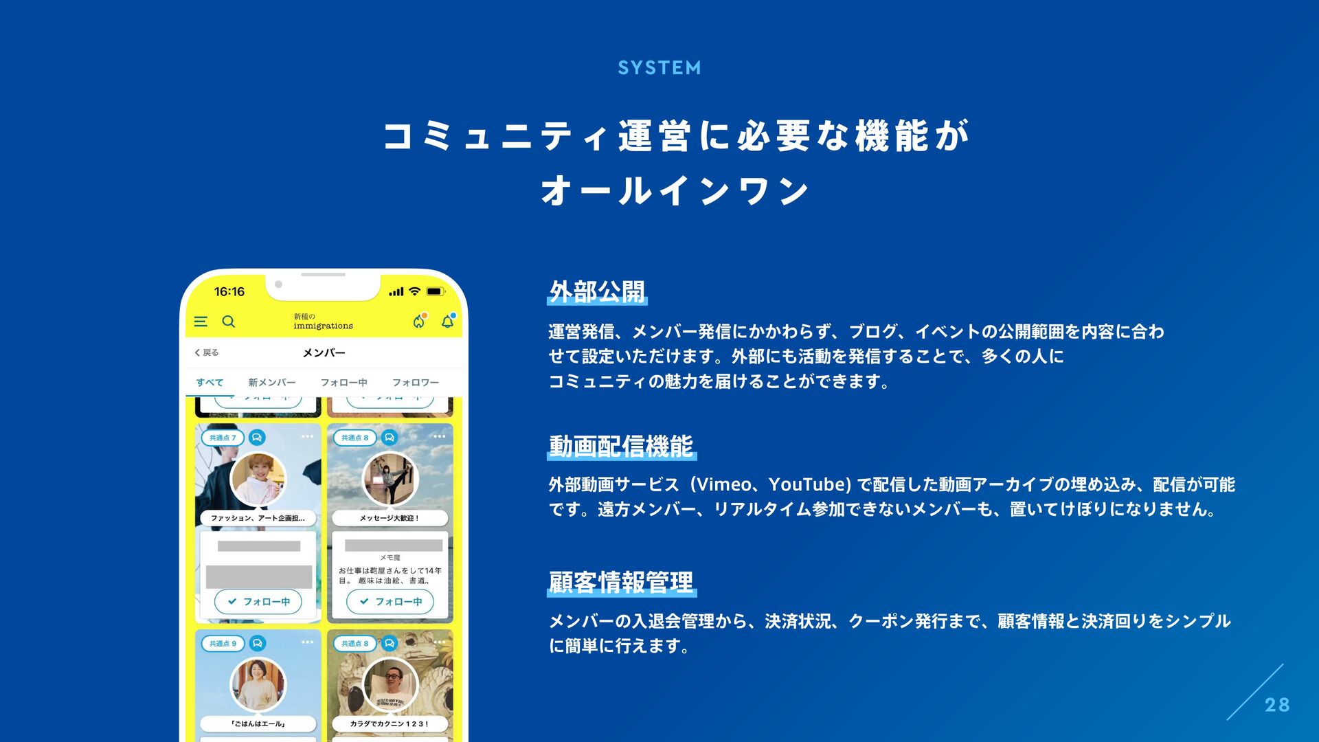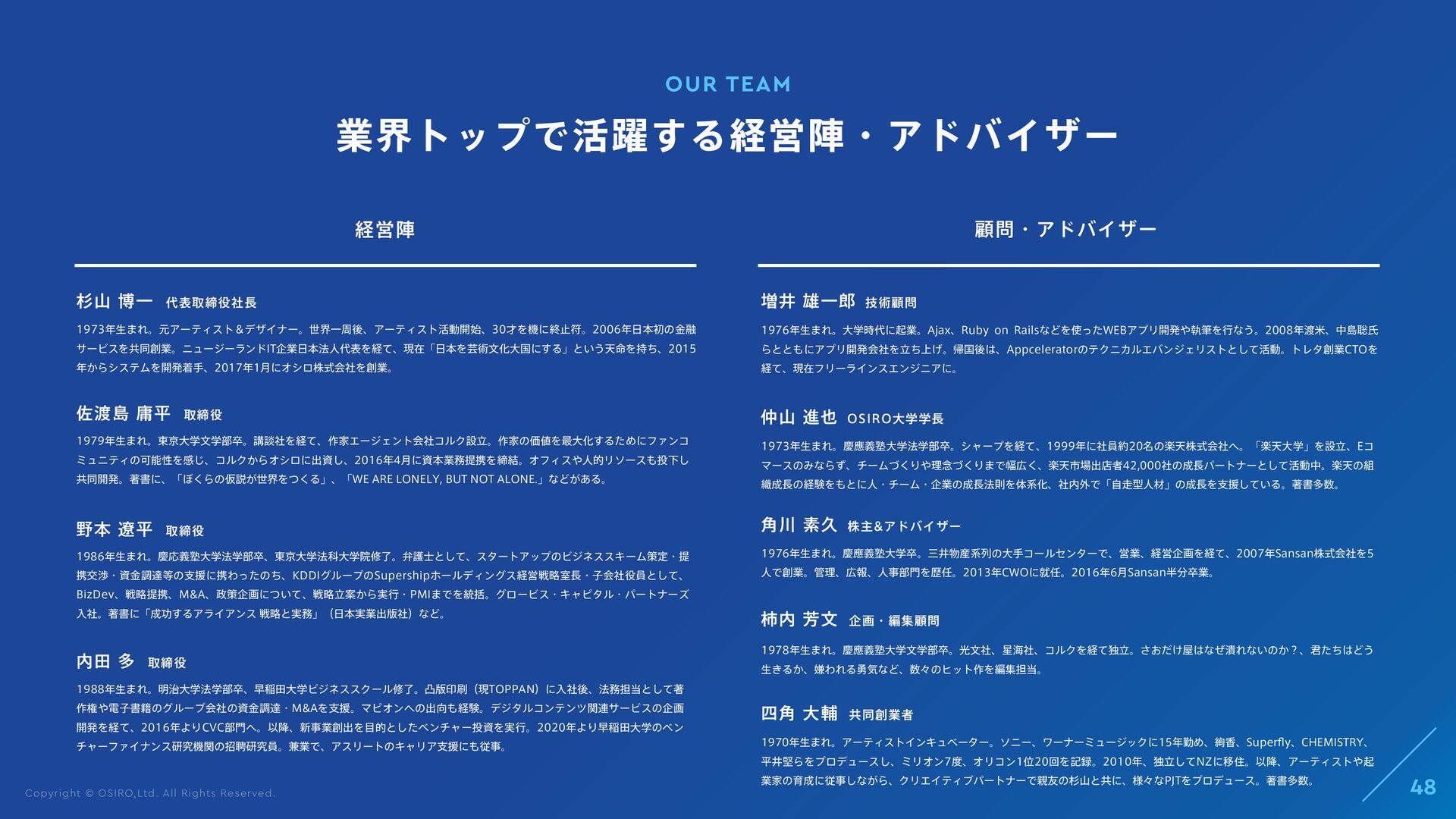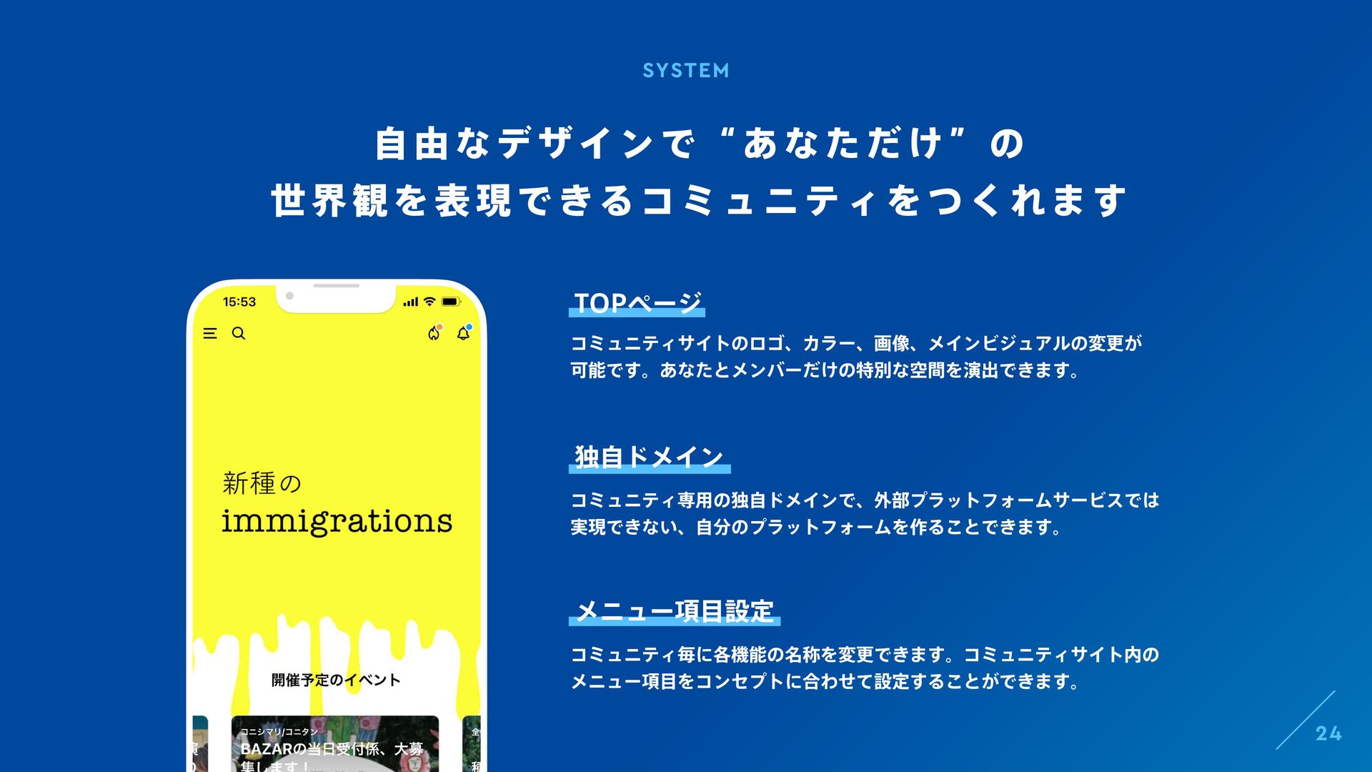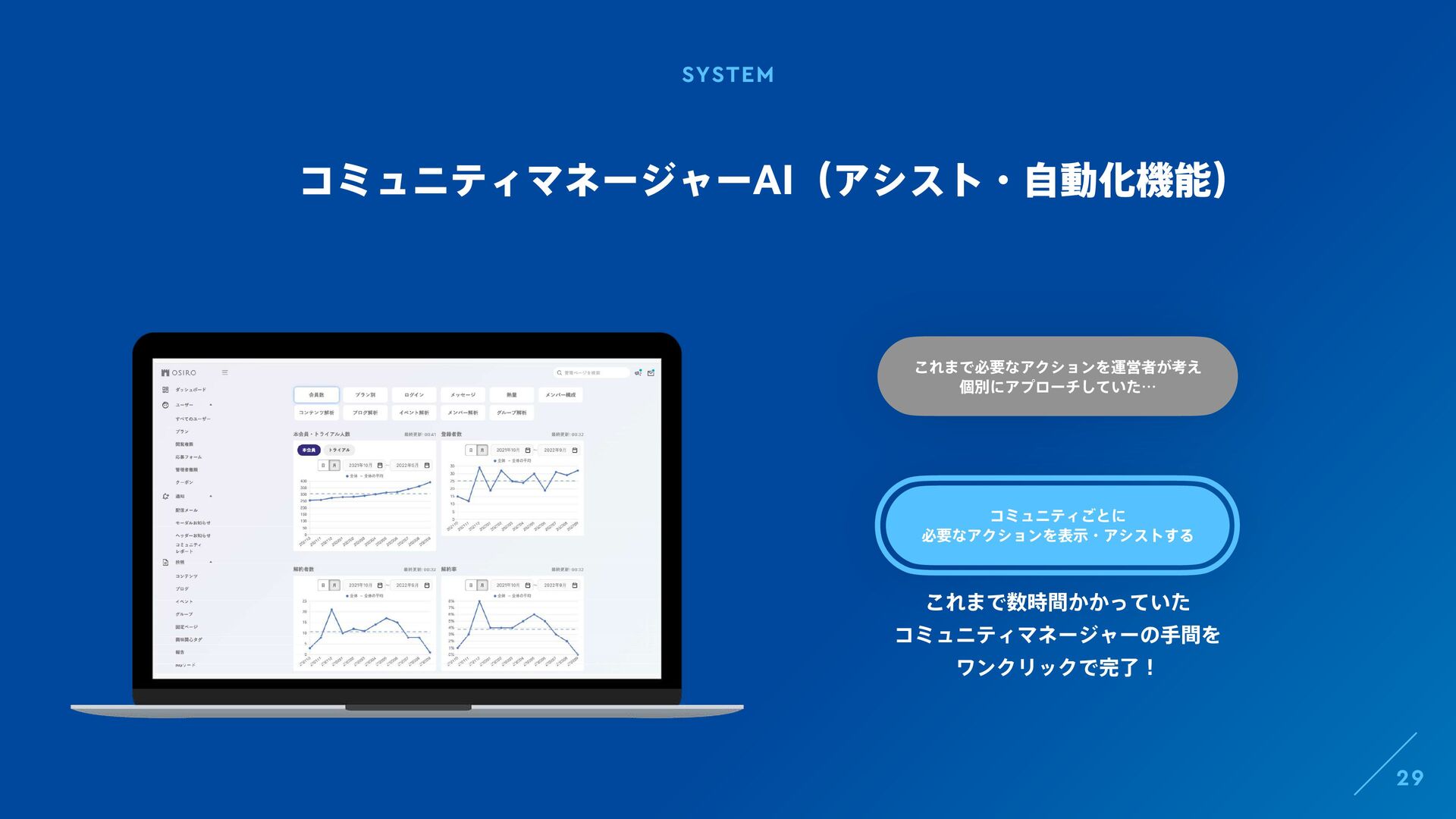 ʮ04*30ʯɺίϛϡχςΟઐ༻ͷΦϯυϓϥοτϑΥʔϜͰ͢ɻ ʮຊΛܳज़จԽେࠃʹ͢Δʯͱ͍͏ϛογϣϯΛ࣮ݱ͢ΔͨΊʹɺ࡞ՈɾΞʔςΟετɺΫ ϦΤΠςΟϒ࢈ۀͷํʑ͕࡞׆ಈΛଓ͚ΒΕΔΈΛ։ൃ͠ɺʹЌ൛ͷఏڙΛ։ ࢝͠·ͨ͠ɻ ࠷େͷڧΈʮੈք؍ͷදݱʯͱʮίϛϡχςΟͷ׆ੑԽʯͦͯ͠ʮίϛϡχςΟϚωʔδϟʔ "*ԽʯͰ͢ɻੈք؍ʹͩ͜ΘΕΔϓϥοτϑΥʔϜ্Ͱϝϯόʔಉ࢜ͷίϛϡχέʔγϣϯ͕ ׆ੑԽ͢Δ͜ͱΛಘҙͱ͍ͯ͠·͢ɻ ݱࡏݸਓΫϦΤΠλʔͷΈͳΒͣϒϥϯυɾاۀ͚ʹɺίϛϡχςΟ͕׆ੑԽ͢Δ͜ͱΛ తͱͯ͠ɺձһཧɺֹ݄ɾεϙοτ՝ۚɺίϯςϯπ৴ɺάϧʔϓɺνϟοτɺϙΠϯ τɺΠϕϯτɺ͞ΒʹΧʔτϨε&$·ͰɺίϛϡχςΟӡӦʹඞཁͳશͯͷػೳ͕Ұͭʹ ूͨ͠γεςϜɾαʔϏεΛ։ൃɾఏڙ͓ͯ͠Γ·͢ɻ ͜͏ͨ͠ػೳΛ௨ͯ͡Θͨͨͪ͠ʮ04*30ʯɺϒϥϯυɾاۀྔͷߴ͍ίΞϑΝϯͷ Έ͕ू͏ʮϑΝϯΛͯͳ͢ʯΛఏڙ͠·͢ɻ SUPPORT ίΞϑΝϯͷຬ͕ ͞Βʹ্͕Δ ίΞϑΝϯ͕ ৽ͨͳϑΝϯΛݺͿ ίΞϑΝϯ͕ϏδωεΛ ظతʹࢧ͑Δ SATISFACTION MOUTH TO MOUTH Copyright © OSIRO,Ltd. All Rights Reserved. Copyright © OSIRO,Ltd. All Rights Reserved.