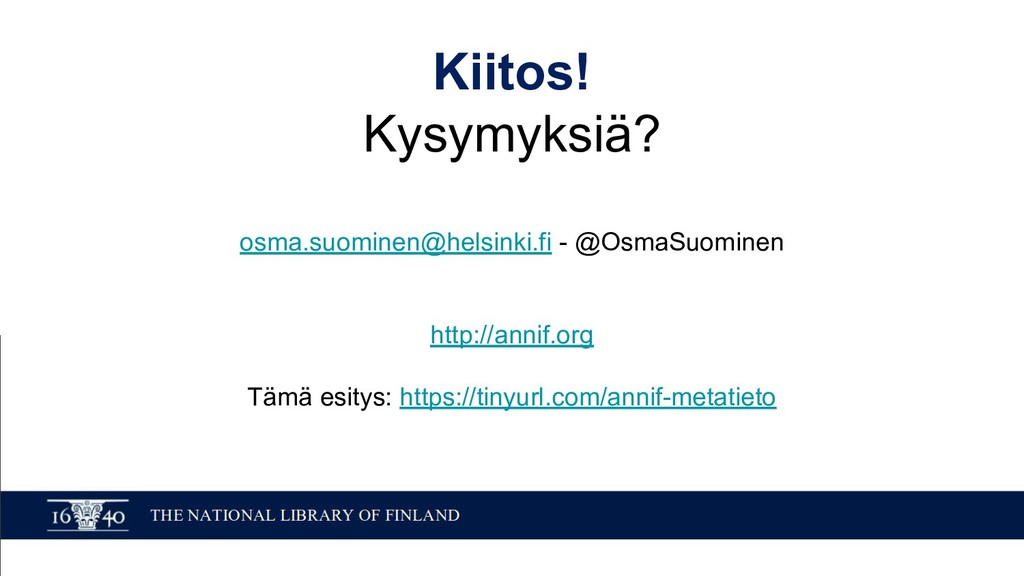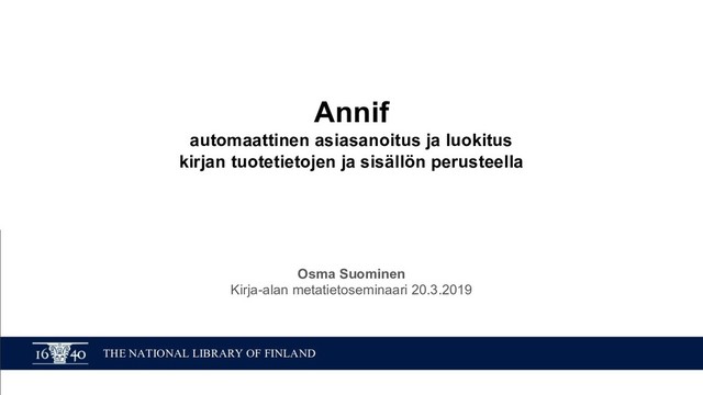 Esitys Annifista Suomen Kustannusyhdistyksen ja Kansalliskirjaston yhteisesti järjestämässä kirja-alan metatietoseminaarissa.